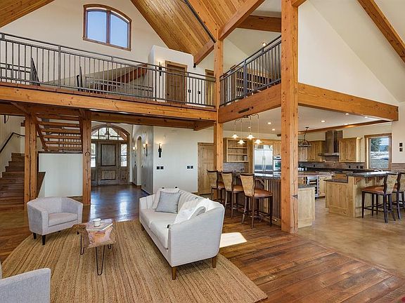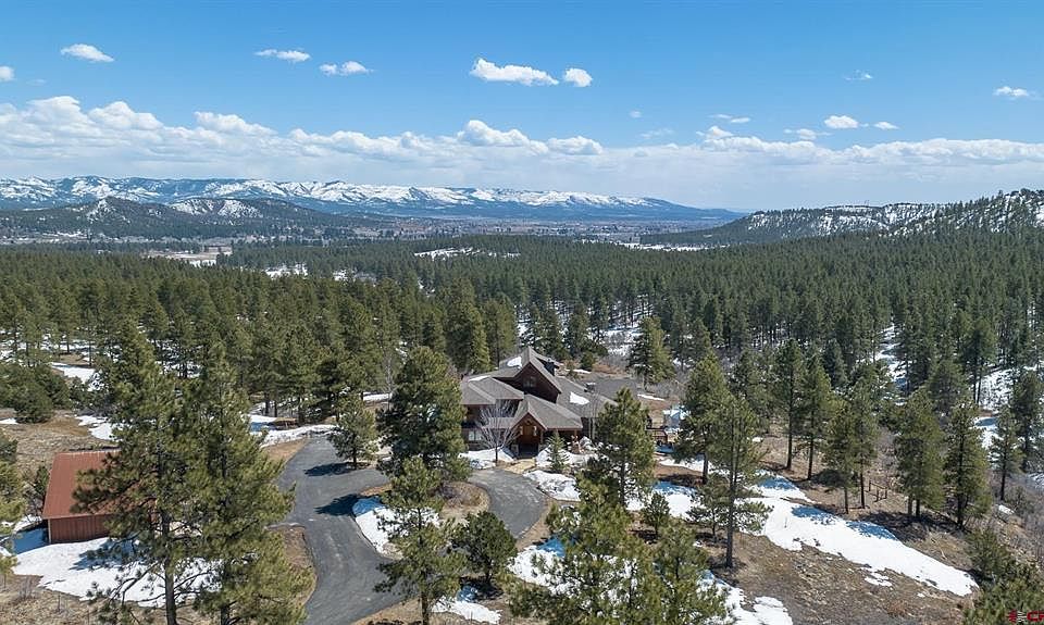 Welcome home to this beautiful custom home with stunning mountain and valley views, private 35 acre lot in Bayfield, approx. 35 min from Downtown Durango. Located in the beautiful Pine River Valley, this home was custom built in 2006 in the scenic gated Eagles Ridge subdivision and was a past participant in the Parade of Homes! Upon entering the massive glass and wood front door, you’re welcomed by a spacious living area, tongue and groove vaulted ceilings, a floor to ceiling stack stone fireplace and 180 degrees of gorgeous views. The primary suite is located on the main level and has large windows, along with glass French doors (so much light and views) which lead out to a private deck and fenced dog run. Spacious master bathroom with 2 sinks, a vanity area, a stand-alone tub, tiled shower, and a 2 large walk in closets. The main level flooring is stained concrete with accents of rustic wood in the living room and office. The kitchen includes a copper finished island with a prep sink and wine fridge, granite counter tops, lots of sit up bar space for entertaining, and all stainless-steal appliances. The dining nook is just off the kitchen and has a door to the spacious outdoor covered patio with a wood burning fireplace, flag stone walks with mature landscaping. Off the living room, there’s a large office with built-in shelving/cabinets and shares the two-sided living room fireplace. The wood stairs with custom metal railings takes you up to the carpeted upper level which includes a large loft area (office, den, workout, studio), 2 bedrooms, and a full bathroom. The attached two-car garage is heated including a built-in a dog washing station. The detached garage/barn includes a pleasant, covered deck to enjoy views, workshop space, pull-down stairs to access the useful upper level including a garage like window and an electric winch to bring items (or hay) to the upper level. Additional inclusions: a large heated utility/attached storage room (accessible from the exterior, shelving will stay) an awesome Growing Spaces greenhouse (18 ft diam. 250 SF, 10 ft tall) storage shed. The Eagles Ridge subdivision has over 800 acres of meadows, ponderosa pine forests, and preserved wildlife, with paved roads, and underground utilities. The town of Bayfield is just 13 minutes away. Domestic well, you can have horses. Both lifestyle and virtual tour videos are linked to this listing, be sure to preview!