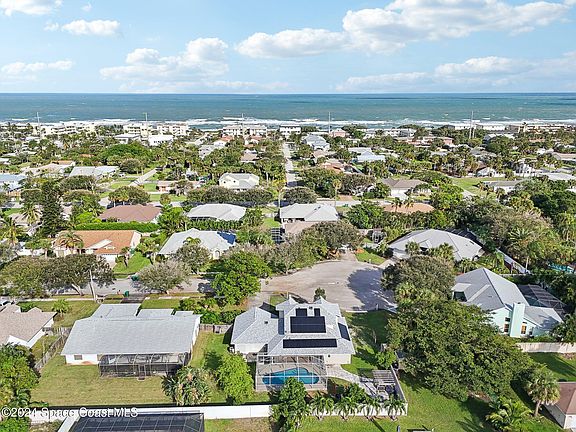 Just a 9-minute walk from the beach is your charming pool home in the heart of Indialantic's desirable SOFA district with no HOA. Ideal home for entertainment in your screened-in lanai, which has a custom pergola and outdoor fire pit for gatherings. Updated kitchen includes white cabinets, SS Appliances, Samsung FlexDuo smart range, InstaView refrigerator, granite tops & water flow tile backsplash. Newer herringbone tile throughout main areas. Located in a quiet neighborhood with a cul-de-sac where the kids can play safely. There is plenty of room to park your boat or RV on the side of the house. The accessible ground-floor primary bedroom overlooks the enclosed pool. Upgrades include an energy-efficient hybrid water heater, LED lighting throughout, a Newer Roof (2019), pavers, and 32 solar panels with lower utility bill benefits.