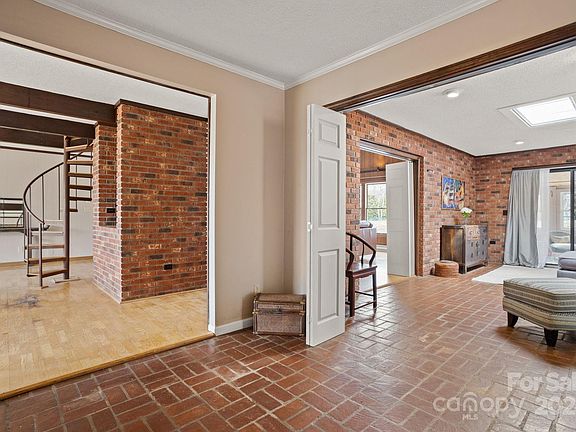 Awesome mountain retreat home with tree lined driveway nestled on 5 acres in the historic and beautiful town of Hendersonville, NC. This cool late mid-century home has features to fall in love with! Original brick floor, giant vaulted ceiling with wood beams, spiral staircase to quaint loft, and beautiful built-ins and fireplace in the kitchen!