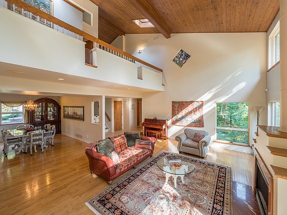 Stunning 4 bed 4.5 bath nestled in nature with spectacular wooded panoramic view seen from all levels through ceiling-floor windows & skylights. Custom home on 3 lots built by renowned PGH architect in art of Feng Shui to incorporate harmony & balance w/nature. Step into grand foyer and into the open flow of the multi-level home. Main level dining, living w/fireplace, family room that opens to deck, powder room, & kitchen with center island & updated appliances with 2 story high ceilings. The upper level has sizeable bedrms each with full bath. The spacious owners' suite has private deck & bath with dble vanity & Jacuzzi. Lower level has 4th bedroom with private covered patio & full bath with steam shower, game room with corner fireplace, wet bar, & walls of glass with entry to back deck & gazebo. Included is a studio/office with private entrance. Expansive grounds include large side yard, pro landscaping, Omni-stone drive & walkway, & fish pond!