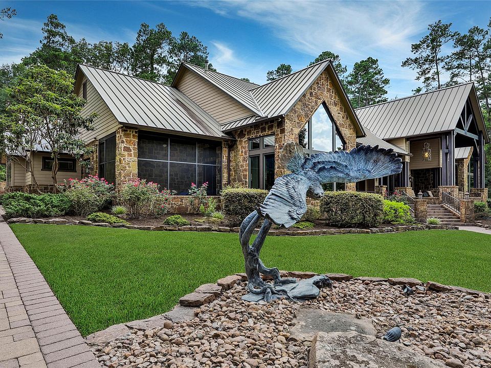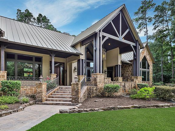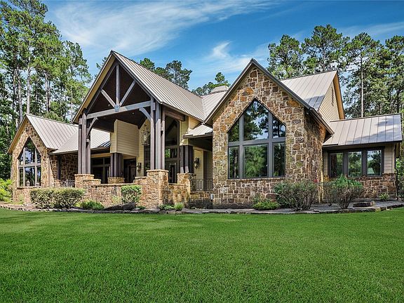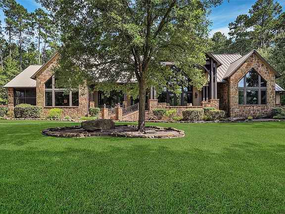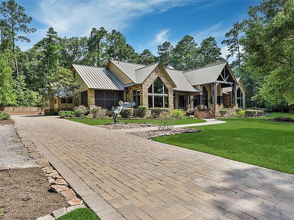 Come see this gorgeous lodge-like custom one story home on 27 beautiful rolling acres in Walker County near New Waverly.Huge ceilings, beautiful wood beams & tons of custom millwork.Kitchen is complete w/Wolf appliances, 2 sinks, huge pantry, & more.Primary suite is wheelchair ready, has huge his/her closets(one is concrete reinforced), exercise/study area & fireplace.Gorgeous views of the almost 3 acre trophy stocked pond(Bass, Stripers, Bluegill)from the Primary Suite, guest suite, office, dining room, & elaborate front porch.Large pool & spa to keep you cool during the hot summer months.Oversized 3 car garage, & giant gameroom & bathroom above.Huge heated barn w/bathroom for the workshop & all of your toys.Additional covered parking for an RV at the secondary barn, where the previous owner kept their horses, w/office, tack room & bathroom.Fenced & cross fenced.Giant generator keeps the entire property w/power even during heavy weather events.Over 1500 SF of covered porches.