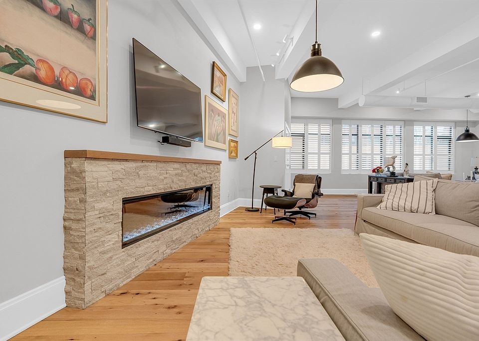 Style, utility and expanse combine in this stunning home at Laconia Lofts, a massive and meticulously renovated 3 BR plus separate office. Enter to one of two wide-open living areas w/soaring 11' ceilings, enhanced by an impressive focal point: an oversized linear electric FP. A wall of windows extends along a 2nd spectacular living and dining space. The open floor plan includes a gorgeous chef’s kitchen w/ 4 person island, wine fridge, gas ckg and quartz counters. Primary BR w/custom closets, transom windows, stunning sliding barn door entrance and en-suite bath w/separate shower and jetted tub. One of two additional BRs features a sleeping loft or storage area, accessed by a rolling library ladder. Upgrades include new HVAC, custom lighting and millwork and exquisite random width red and white oak floors throughout. A common roof deck offers stunning city views. One garage space included. Steps from Peters Park and all of the South End's finest shops and restaurants. A showstopper!