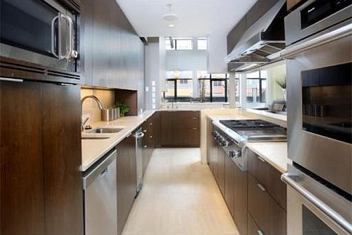 Stunning two bedroom, two bath loft home at Laconia Lofts in the thriving SOWA area of the South End. The dramatic living area has a fireplace, home theater and access to the 400 s.f. terrace w/Back Bay views. Four skylights and wall of windows contribute to the abundance of natural light. The dining area is complimented by a full size integrated Sub-Zero wine refrigerator, built in buffet and bar space. The kitchen has travertine marble floors and counters, Thermador double wall ovens and cook top, Sub-Zero refrigerator, Kitchen Aid d/w. The second floor has the master suite, laundry room & mezzanine study. The sleek master suite features a wall of custom closets and a walk in closet. Master bath has a steam shower, separate soaking tub and pure white marble. Walnut hardwood floors and home audio system throughout the home. Deeded roof deck area. Two garage parking spaces. The building has professional on site management and high owner occupancy.