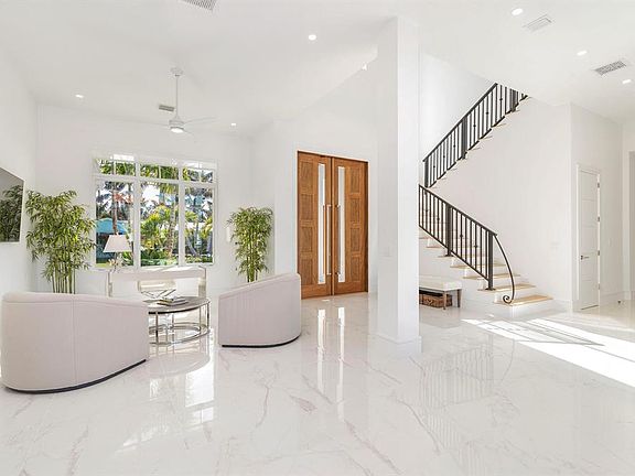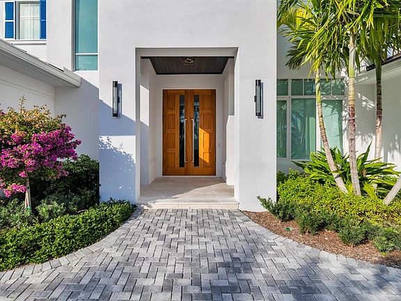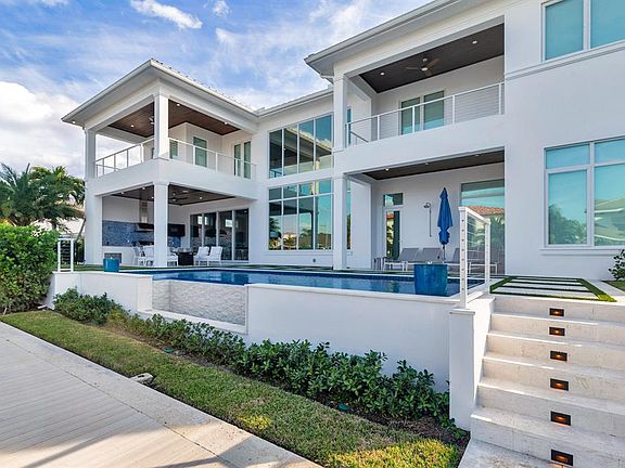 This breathtaking two-story modern residence, completed in 2023 is situated on a 100x110 lot with 100 feet of waterfrontage. The home offers stunning views of both the canal and the Intracoastal, seamlessly blending luxury, comfort, and contemporary design. With 4 bedrooms and 4.1 bathrooms, this 4,852-square-foot home boasts an expansive total area of 7,246 square feet. Designed with exceptional attention to detail, the residence is filled with natural light, thanks to floor-to-ceiling windows and soaring 23-foot ceilings. The open-concept layout provides a sense of space and grandeur, while all-impact glass and doors ensure security and peace of mind. The main level features a gourmet kitchen equipped with top-of-the-line appliances, a walk-in pantry, custom lighting, and a water filtration system. There is also a thoughtfully designed guest suite, and a spacious laundry room. Upstairs, the luxurious primary suite is complemented by two additional guest suites, a second living area, three balconies, and a convenient second laundry room. Step outside and enjoy an entertainer's paradise. The property includes a fresh water, heated infinity pool surrounded by an open patio, a summer kitchen, and two covered loggias, one of which offers a dedicated outdoor dining space. With a full sauna and ample outdoor living areas, the home invites you to relax and unwind. The property also offers a three-car garage configuration, with a two-car and a one-car garage, as well as additional driveway parking. Every element of this home has been designed with both form and function in mind, creating a seamless balance of luxury and practicality. Perfectly situated in a premier waterfront location, this exceptional residence provides an unparalleled lifestyle with easy access to boating, dining, and entertainment.