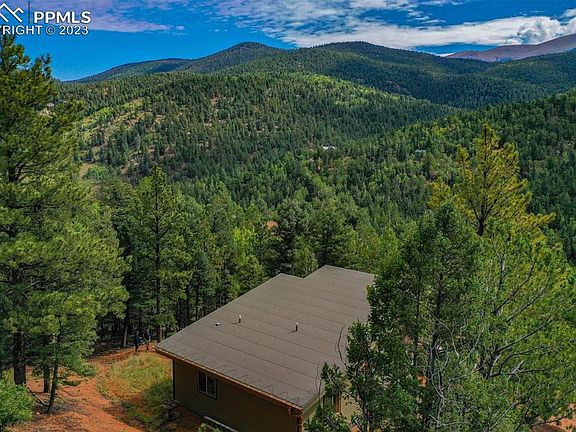 Looking for a perfect mountain full time home or getaway? Here it is! Built in 2019, this modern rustic raised ranch home is nestled into the hillside of Rainbow Valley to provide a spectacular view of Pikes Peak, Sentinel point, rock formations, and much more Colorado beauty! Enter the lower level where there are two bedrooms and a spacious family room opening to a patio with a luxurious hot tub. It has a Lopi pellet stove which can heat the entire home efficiently to maintain comfort in the colder months. The upstairs great room is a perfect place to live and entertain as the large windows showcase the stunning views with a lovely composite deck with a modern railing. A sunny kitchen is nicely designed with hickory cabinetry, granite counters, and black stainless appliances. The main floor bedroom has a walk in closet and the main floor bathroom with tiled shower, double vanity, hickory cabinets, and granite counters is across the hallway for easy access. The bright living room with vaulted ceilings features a Vermont Castings gas stove to provide the perfect ambiance when gathering and flows well to the dining area and kitchen. Luxury vinyl flooring throughout the living areas and carpet in the bedrooms. Easy to get to, just two minutes from the Hwy 67 paved roads and the neighborhood roads are county maintained year round. Only 20 minutes to Woodland Park and less than an hour to Colorado Springs. Also 20 minutes to the famous Cripple Creek with abundant options for dining and entertainment. This is a wonderful home for full time living or rental (short and long term.) Don't miss it!