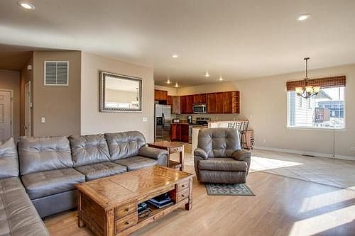Spacious daylight rambler! 5 bedrooms plus an extra room for den. Lower level game room with wet bar and pool table adjoins theater room wired for surround sound.Stainless appliances, laminate floors. Gas fireplace in living room. Main floor features 3 bedrooms 2 baths. Master bath with soaking tub and shower,walk in closet.The main floor takes in beautiful views of Malaga hills. Fenced yard. Small area next to garage for parking a utility trailer or small camper.Main floor laundry room. Central heat and air.Irrigation water and automatic sprinklers