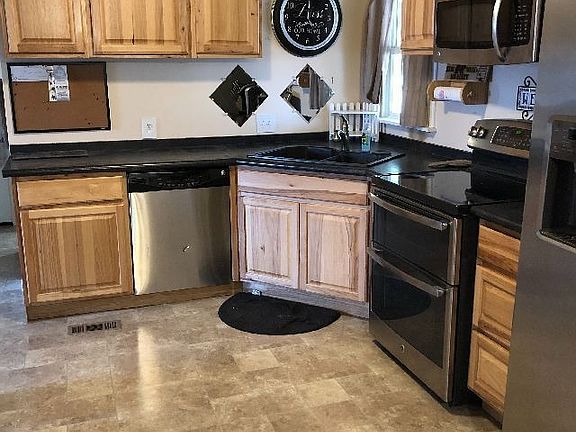 This remodeled home has all vinyl windows, pellet stove in living, new kitchen cabinets and stainless appliances. All electric home with 4 bedrooms and 2 baths. Covered deck and backyard with pond, fire pit and dog kennel. hookup for welder and RV. Storage shed and more. Check out this remodeled home West of school and park!