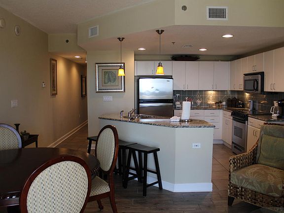 1 bed 2 bath with Bunks at one of the most desired Luxury Resorts on the Beach. Granite counter tops throughout, wood tile floors throughout even in bedroom, Stainless appliances. Live in it full time or rent it as it is a rental machine. Large fitness room, 2 pools, Tiki bar , Conference room, Business center, walk over P5 to Tower 1 pool,plenty of parking. with a side road escape to middle beach road. A must see condo.