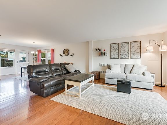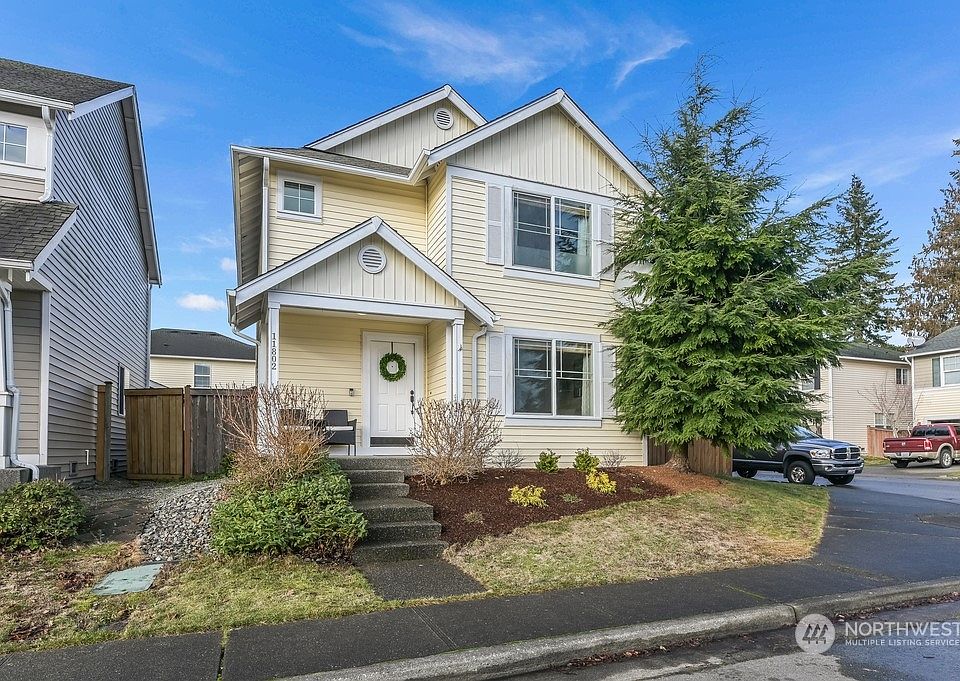 Welcome to this wonderful, move in ready home, conveniently located in Donegal Lane/Silver Lake area. Close to I-5, Boeing and Mill Creek Town Center. Great open kitchen, eating area, living room and half bath on main floor. Primary suite with walk in closet and fully remodeled bathroom and 2 oversize bedrooms plus a second full bath on upper floor. Located on a quiet corner lot with a small easy care front yard and a fenced back yard with a lawn and nice sized patio. Nice 2 car detached garage with extra parking on an alley. Pre-inspected.