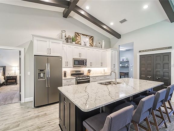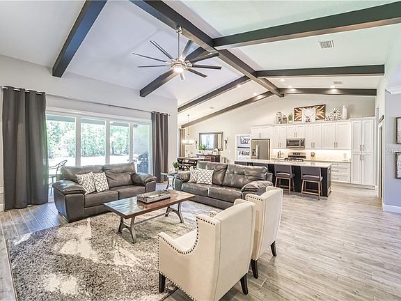 • Interior Features: Ceiling Fans(s), High Ceiling(s), Master Bedroom Downstairs, Open Floorplan, Split Bedroom, Walk-In Closet(s), Crown Molding, Solid Wood Cabinets, Living Room/Dining Room Combo, Solid Surface Counters, Built in Features, Window Treatments, Vaulted Ceiling(s)