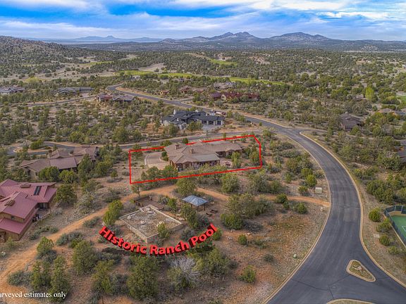 Fabulous Hilltop lot Backing to 1 acre Historic Ranch Pool Preserve & located across the street from Ranch Compound. 360 degree views including Granite Mountain & Williamson Valley. 3 beds w/ en suites, 3.5 bath Plus den, Wet bar with mesquite counter , wine & small bar refridgerator. 2nd Master with jacuzzi tub & private outside entrance. Den, formal dining room, Butler's kitchen ,Lrg Master Bedroom w/sitting area, Lrg walk in closet & fireplace, Lrg front porch with unique fire pit & custom seating area. Knotty Alder wood kitchen cabinets & doors throughout, hand etched beams in entry area & living room. 600 sq ft east facing covered back porch with fire pit, outdoor fans, speakers, great for entertaining. 3 car garage with workbench and cabinets.