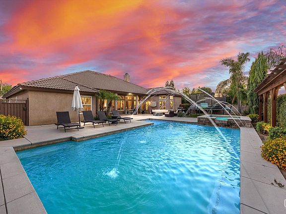 Absolutely stunning Olive Park residence featuring a pool, spa, and solar, built by Soper Homes with one of their most sought-after floorplans. This open-concept design welcomes you through elegant double doors into a home showcasing engineered hardwood floors, upscale lighting, trey ceilings, and plantation shutters throughout. The remodeled kitchen is a showstopper, offering quartz countertops, custom tile flooring, a farmhouse sink, and crisp white cabinetry.The luxurious main suite boasts a two-sided fireplace, separate soaking tub and shower, a spacious walk-in closet, and French doors leading to the backyard. All bedrooms are generously sized, including a fourth bedroom that is exceptionally large (without a closet). Tasteful dcor and timeless neutral tones create an inviting atmosphere. Entertainer's dream backyard with a large covered patio, sparkling pool with water features, rock-accented spa, lush mature landscaping, always-green artificial turf and two decorative trellises