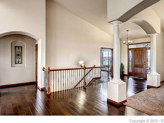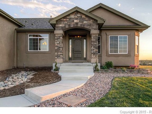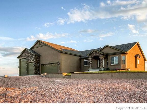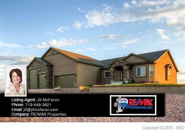 This home is an absolutely stunning custom rancher w/ plenty of space for all of your needs! Located on 2.5 acres, this property offers privacy & a sense of community. Nothing can compare to the Pikes Peak, mountain, Front Range &Black Forest views this lot offers! The home provides 5 beds w/ 2 more potential beds (the office & theater room), 4.5 baths, gourmet kitchen, theater room, wet bar w/ wine fridge, 4-6 car (RV capable) & more! 20 mins to Colorado Springs & 50 to Denver. The spacious foyer features vaulted ceilings & hand-scraped hardwood flooring. Right of the entry is the large home office w/ closet & bay window. Left of the entry is the spacious dining area separated w/ custom arches & pillars. The gourmet kitchen offers every upgrade: 42-inch, raised-panel cabinetry, pantry w/ beveled glass door, granite slab counters, bar, double ovens, gas range, & hardwood floors. The well-equipped kitchen overlooks the large living/great room, focused around the lodge-like gas fireplace & built-ins. The living room also has access to the large covered deck. The main-level master suite provides a sitting area, bay window, walk-out, & spa-like master bath w/ double vanities, jetted tub, tile shower & walk-in closet. Also on the main is the 1/2 bath, laundry w/ sink & garage access, as well as a large secondary bedroom w/ its own bath. The garden-level basement provides a huge family room, rec area w/ wet bar, access to main storage room & under-stair storage (possible wine cellar), & a well-appointed theater room w/ 2 closets, built-ins & wiring for surround sound. Three large secondary bedrooms & two full baths finished the basement. The huge covered deck is the perfect place to relax & take in the beautiful scenery. The deck is wired for speakers & 2 stairs lead to backyard. Listing Agent: Jill McFeron Company: RE/MAX Properties, Inc. Phone: 719-648-3821 Email: jill@jillmcferon.com
