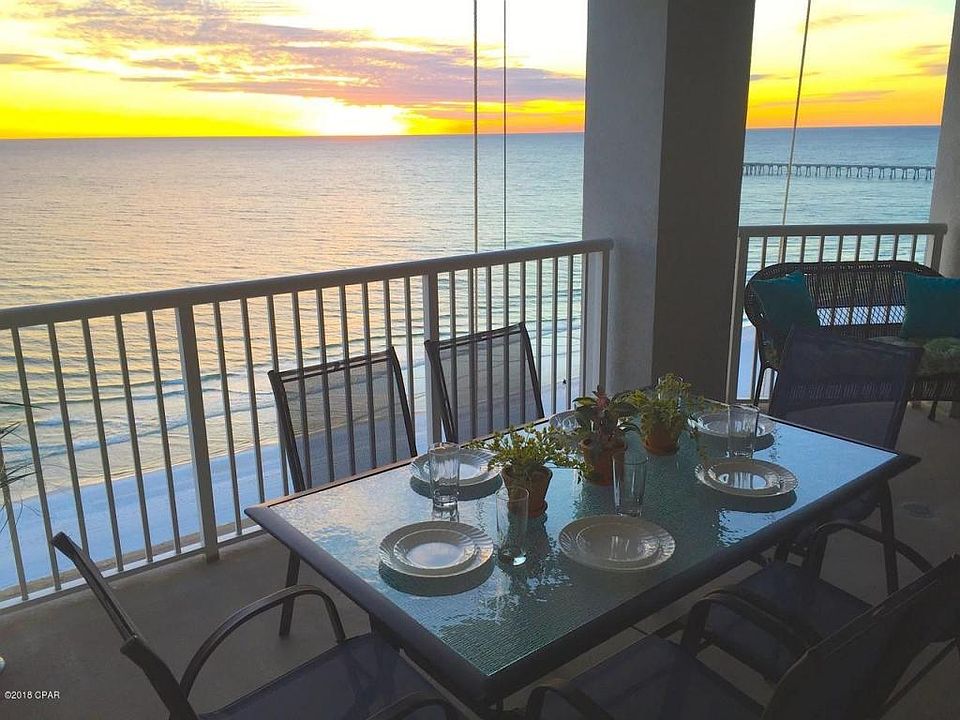 Luxurious Gulf front living at one of the best resorts on the Beach ~ Grand Panama. The Gulf front Master Suite opens to the large balcony, also accessed by the living room with panoramic Gulf views. Many upgrades and decorator-perfect finishes including tile floors throughout unit except the bedrooms, granite counters, tile kitchen back splash, stainless steel appliances and beautiful furnishings.