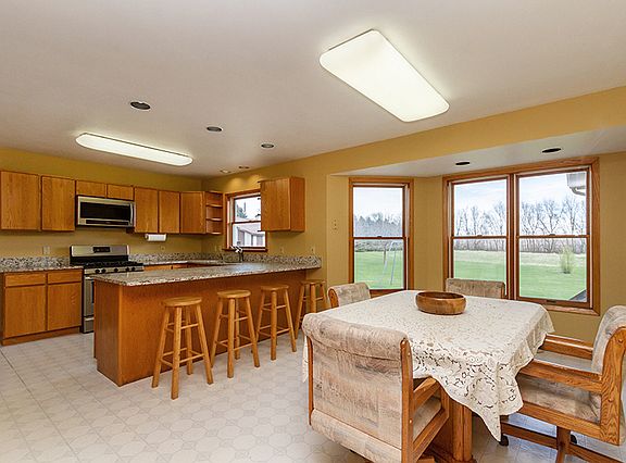 Don't miss out on this spacious 2 story home with a FULL in-law arrangement! Beautiful brick home sits on 5 acres with an attached 3 car side-entry garage and additional detached 2 car garage/Quonset building. Light and bright 2 story foyer welcomes you into your new home. The abundance of windows offers natural light throughout. GLEAMING Hardwood floors in the Living and Dining area. Spacious eat-in kitchen features stainless appliances, granite countertops with breakfast bar, and additional eating area. Large family room with floor to ceiling wood-burning, stone fireplace opens to your sunroom and overlooks the beautifully manicured backyard. Main floor convenient Master Suite w/private laundry PLUS the second floor offers 3 additional bedrooms and secondary laundry. Finished lower level ideal for an in-law arrangement complete with a bedroom, 2nd kitchen, full bath, 3rd laundry room, and a rec room that walks out to the peaceful backyard. What more could you want?