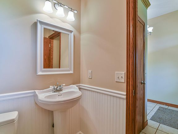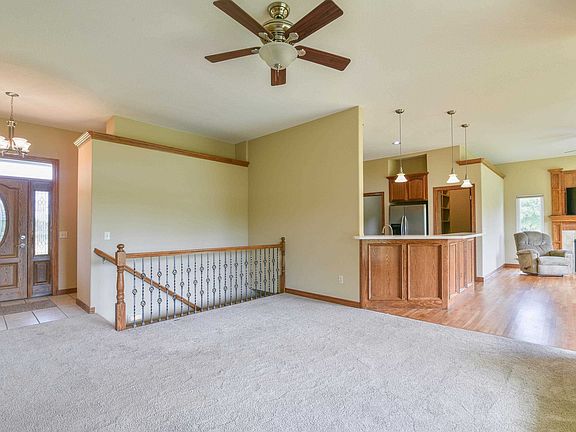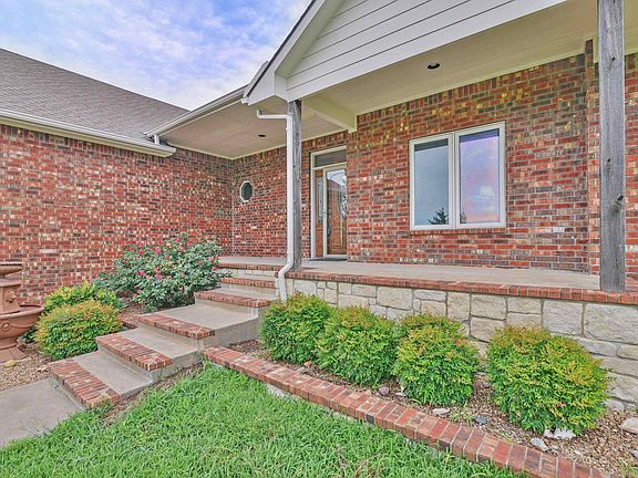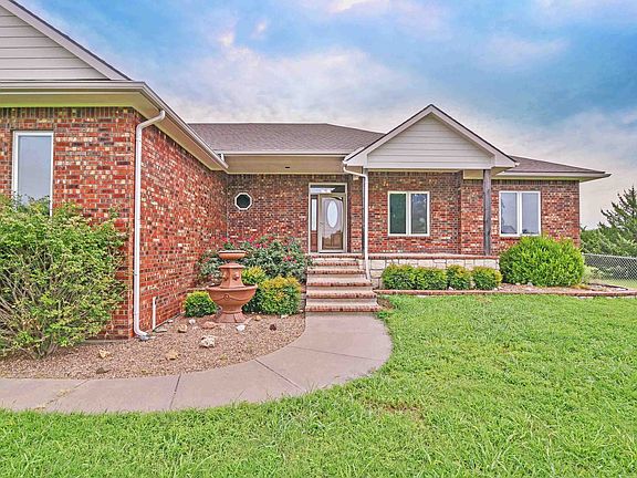 Gorgeous home with shop on acreage is the American dream! This one is amazing! Start outside with an oversized 29X28 end load garage, full brick and stone front, big covered porch, walk-out basement, covered Trex deck overlooking fishing pond, very nice 60X43 shop with 14' door and plumbed for bathroom, and a sprinkler system. Inside there is a half bath off the foyer, 10' ceiling in great room, solid surface tops with integrated sinks, beautiful hardwood floor in the dining, hearth room, kitchen and laundry room. All appliances remain in kitchen with double oven, breakfast bar, and a big walk-in pantry! Imagine sitting in your hearth room with a cozy fire, and watching the snow fall outside the big picture windows! Master has bay window, coffered ceiling, two vanities, jetted corner tub, separate shower and walk-in closet. Wrk-out basement has huge family/game room and is roughed in for wet bar, and pool table stays! Bonus room in basement has laundry tub sink. Second master suite in basement with it's own bath, plus a concrete tornado room. Home is heated and cooled with efficient geo thermal system. Clearwater schools are Sedgwick Counties best kept secret! This is the place for you!