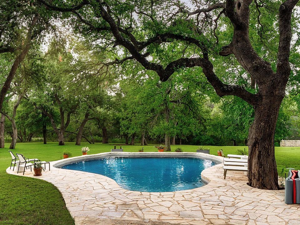 This private estate has it all- a beautifully remodeled main home, manicured grounds featuring iconic Austin oak trees, a refreshing pool with limestone patios, a full guesthouse, and the trickling sound of a year-round creek- a branch of Long Creek. The residences have been thoughtfully renovated with a standing seam metal roof, updated windows and doors, white oak hardwood floors, designer bath upgrades, and extensive cabinetry. Upon entry, the grandness of this home is demonstrated with the floor to ceiling glass and a substantial stone fireplace. The main level offers versatility with multiple spaces for living and dining, all with views and exits onto the back deck. The primary bedroom has deck access as well and features a bright bathroom with a walk-in shower and large closet. The open living and dining area was recently updated with custom cabinetry, KitchenAid appliances, a 5-burner gas range, and quartz countertops. The main level also features a full secondary bath and a bedroom that serves as a fantastic office. The reverse floorplan optimizes the views and outdoor accessibility. Downstairs is a media room with a mini-kitchen, three large bedrooms, two full bathrooms, heated and cooled storage, a large laundry room, and access to the exterior patios and pool. The separate guest house is a studio space with a full kitchen, laundry facilities, and a full bath – it also has an additional sleeping loft and attic storage. You won’t need to go on vacation with this outdoor space- there’s something for everyone’s interest – drop a line in the creek, take swim in the shaded pool, shoot some hoops on the sports court, or relax among the roaming deer with a cup of coffee on the enveloping decks. Storage abounds with a stand-alone shop, open storage above the garage, and large closets and custom cabinetry at every turn! Enjoy quiet country living, an ATX address, quick access to both Austin and Dripping Springs, and highly acclaimed DSISD schools.