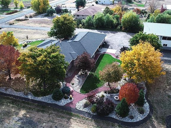 Welcome to your dream home! Nestled on over two acres with mountain views, this stunning 4 bedroom, 2 office, 5-bathroom ranch-style residence is a true gem. As you approach the home, you'll find a large front patio, perfect for sipping coffee in the morning sun. Step inside to an open floor plan and vaulted ceilings, which create a spacious and inviting atmosphere. The open-concept layout seamlessly connects the kitchen, dining area, family and living areas, providing the perfect space for entertaining family and friends. The kitchen is equipped with stainless steel appliances, granite tile counters, tile backsplash, an island, ample counter space and a pantry. Large windows flood the living spaces with natural light. Step outside to the expansive backyard, where you can enjoy the large covered patio, host gatherings, or simply enjoy the tranquil sounds of the decorative fountain while looking at the mountains. Professional landscaping and the amazing raised fire pit area give this yard a resort like feel! Also out back is a 2400sqft heated outbuilding-large enough for an RV, boat and/or any recreation vehicle you might have and there’s still room for a huge workshop. Back inside - the fabulous primary suite boasts not only a generously sized bedroom with vaulted ceilings but also an indulgent steam shower and radiant heat flooring in the ensuite bathroom and large walk-in closet with custom shelving. Also on the main floor, there is a secondary bedroom and full bathroom, a large office (could be a 6th bedroom) as well as an ample sized laundry room. On the lower level you’ll find a huge living/rec room, 2 bedrooms, a large office, a workout room and 2 bathrooms. The oversized 4 car garage has a man cave themed half bath. This home is not just a residence; it's a lifestyle. Don't miss the opportunity to make this exquisite ranch home your own!