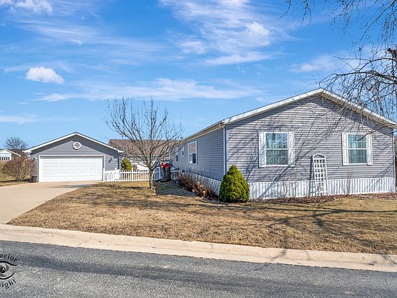 Welcome to this pristine mobile home that sits on a fenced in corner lot with a 2.5 car garage!! Home offers new carpet and flooring throughout, newer appliances, new furnace, new air conditioner, crown molding and newer siding. The enormous kitchen with skylights is large enough for all your get togethers in addition to having a separate dining room. Primary suite offers a walk in closet, jetted tub, double sink and a separate shower. There is an additional bonus room with French doors that is currently be used as a craft room but can be used as an office, library or 3rd dining room...whatever you desire. This is not your basic mobile home....walls are drywall, large double wide, 2.5 garage has a large workshop in back with a storage loft on top, tastefully decorated, beautifully landscaped and wonderfully taken care of! Home is located in the highly desired over 55 community, complete with Club house that offers organized activities, nearby fishing pond, a walking trail and is golf cart friendly!