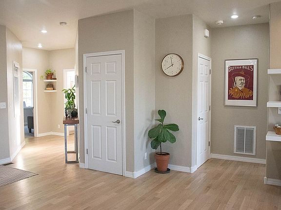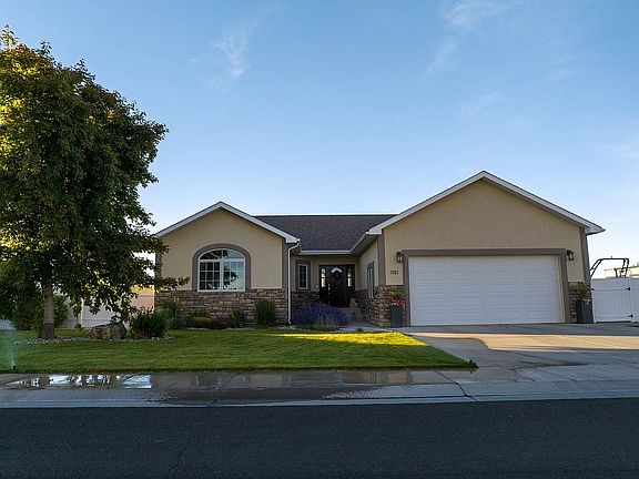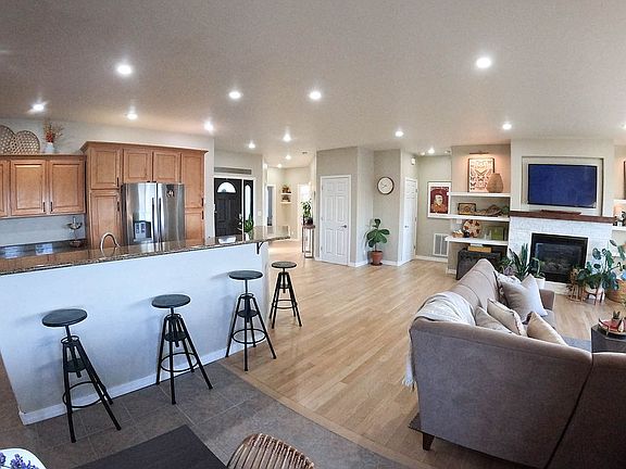 This amazing home offers a beautiful open floor plan with tall 9 ft ceilings. High quality and custom finishes can be found in every room. Real hardwood floors in the main living areas, gas fireplace, built in shelving, stainless steel appliances and granite countertops throughout. The kitchen has ample storage with large cabinets and features a tall bar perfect for entertaining and extra seating. The dining area with french doors, opens to the spacious covered porch. The large master bedroom features a walk in closet and access to a private patio. The third bedroom, currently utilized as an office, features a custom full room length wood desk perfect for a work from home lifestyle. The entire property has beautifully appointed landscaping and a thriving raised garden with a built in watering system tied directly into the lawn sprinkler system. There is an in-ground trampoline positioned perfectly within the large backyard which is surrounded by a tall privacy fence. The property includes a well for irrigation. The house sits on a 4 ft crawlspace perfect for dry storage. This home is positioned perfectly on a beautiful, quiet street, just on the outskirts of town.