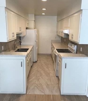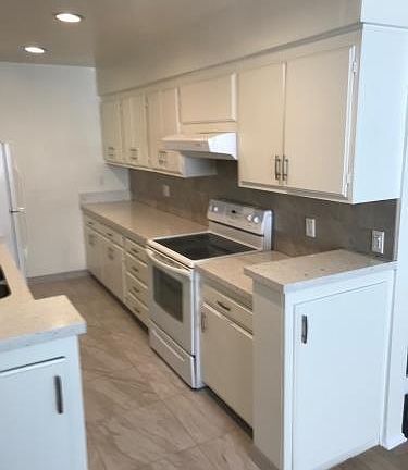 Gated parkingCabinets and pantryGoose neck faucetCeiling fanTiled back splashRecessed lightingVinyl plank flooring