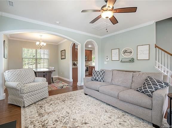 Fantastic home in established neighborhood at the end of a private street. Built in 2014 with a clean and open floor plan. Custom trimmed archways greet you upon entry and you'll notice the craftsmanship from the front porch through the detailed millwork throughout. Features include hardwoods on 1st floor, Deluxe Kitchen with Large Island, Granite Countertops, Tile Backsplash, and Pantry. 42" Cabinets & Stainless Steel Appliances. Bright office / sunroom off kitchen, fireplace with gas logs. Large master Suite with tray ceilings, luxury bath, all tile with separate garden tub and shower. The deck overlooks a private fenced yard and raised garden bed of wildflowers and zinnias. Meridale has a great community pool, has Google / AT&T fiber connectivity, playground, and green spaces. Close to I-485, shops at prosperity village, studio movie grill and Concord mills...