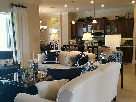 MODEL - Fully Furnished! Beautiful Harmony Model with private pool with water view, furniture, decorations, window treatment, light fixtures, ceiling fans, pocket sliding glass doors, crown molding, coffered ceilings, special trim, wall paper in some locations, and mature landscaping. SS Profile Appliances, Wine Cooler, French Doors from the kitchen to the Lanai, Tile 20", Wood in the bonus room, Carpet in all bedrooms. Site in front of the Park, Private Pool, Outdoor Kitchen, Paver Drive, Walk & Entry.