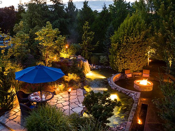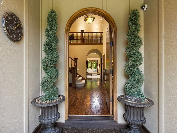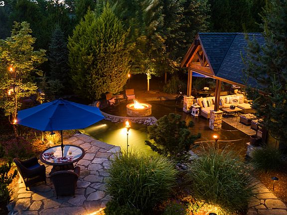 Once in a while, a very special property comes along. Welcome to The Oasis. As you enter into this Modern English Tudor estate through the remote-controlled gate, you'll move through a curved front door entry into the foyer with soaring ceilings, hand brocade walls, hardwood floors and stone fireplace. The island kitchen with hand cut pitched edge black granite, new Jenn Air commercial grade appliances, and amazing views of the waterfalls. Full main floor primary suite with fireplace, walk-in shower, walk-in closet, soaking tub and double sinks. NW Lodge Style Outdoor Living with covered patio and outdoor kitchen with commercial grade natural gas appliances and Fontana Forni pizza oven. Hestan grill, Hestan burners and EVO grill situated in Twin Eagle cabinetry flanked by a huge gas-assist wood burning fireplace. Relax on the patio around a large double ring natural gas fire pit and enjoy the sounds of 2 waterfalls splashing into a 35 foot pond. The upper patio provides an amazing point of view for the natural waterfall and the outdoor living. Ascend to the upper floor on cushy carpet to the home theater. With a 4K 150" Scope Screen and JVC DILA 4K Projector with video processor to handle the screen aspect ratio, the Italian leather stadium theater seating, all audio and video equipment are included! 7.6.2 Dolby Atmos / DTS:X Surround Sound with transducers and sub-woofer system for that "theme park" theater experience. The fully enclosed 2/3 acre property is surrounded by mature hedges, privacy trees, stone pillars, and fencing across the north and west boundaries. Hot Springs "Vanguard" Salt water spa with cover is included. The property is serviced by a large sand filter septic system. (last serviced Fall 2022) and a 282' well with excellent water pressure and water quality. All equipment and accessories onsite are included with the house. Oversized 2 car garage 26'X 26'. Ready to relax at The Oasis?