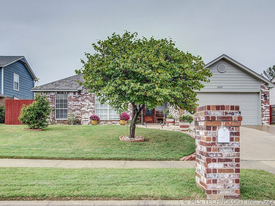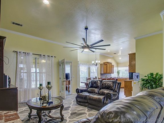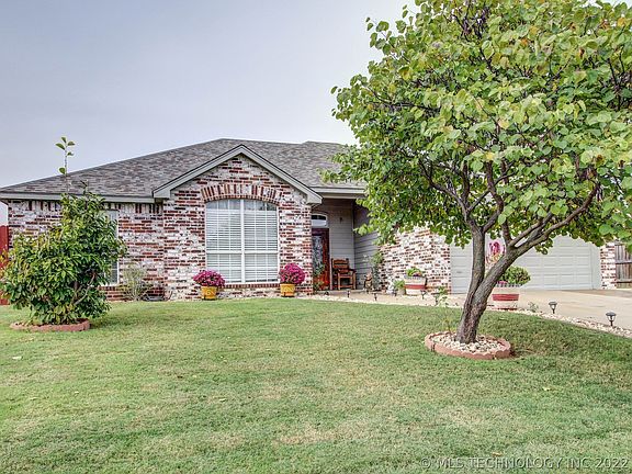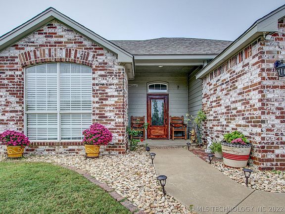 Nice home w/open floor plan and high ceilings. BRAND NEW ROOF and some fresh interior paint. Updates in the past 2 years include exterior paint, SS stove & MW, tile flooring, ceiling fan in living, blinds, and more. Nice built-in bookshelves a plus. Covered patio was converted to a seasonal bonus room w/insulated walls and ceiling; permitted and done per code. Big bedrooms with spacious closets. Three-car driveway. Great storage space in the outbuilding for all your tools and equipment. Owasso schools.