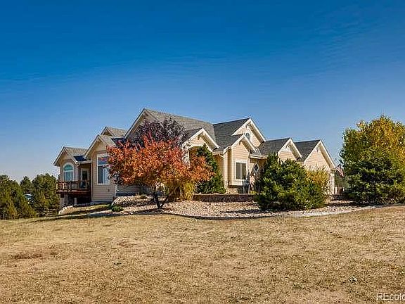 Beautiful home on 5 acres in Franktown, Colorado. If you like beautiful sunsets, mountain views and a secluded Colorado setting you will love this house. This home begins with a beautiful foyer leading to an updated eat in kitchen with stainless steel appliances, granite countertops, and large walk in pantry, dining area and great room with vaulted ceilings and cozy fireplace. Home has been renovated with a new roof, brand new carpet throughout, refinished cherrywood hardwood flooring, new water heater, professionally landscaped yard, new Zuri premium decking, and much more!! Each bedroom has walk in closets, and full bathrooms attached. Downstairs basement, has a mother in law master suite that includes a private office, beautiful bathroom, and french doors that lead to the backyard. Basement is set up for anything a family might need. There is a room for exercising, a sound proof music room, bonus area and large family room that is great for movie night! This charming home, has multiple areas for gardening that includes raised beds located on the side yard, and a large hoop house that will provide plenty of areas for growing your fruits and veggies. This home offers serene living and has many additional features. No HOA. No Covenants. Fifteen-minute commute to Parker. Please call for a detailed list of home features, floor plan or to schedule a private showing.