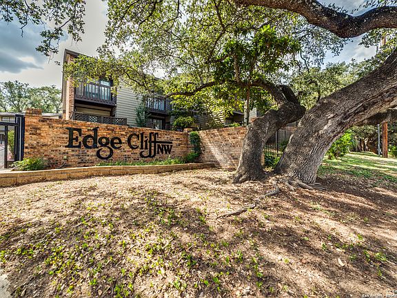 Nestled in the conveniently located and popular, gated community of Edgecliff NW is this great condo with more privacy than most, and mature trees throughout the neighborhood. Building E, Unit #501 is near the pool, but not so close that you're in the splash zone. This updated 2 bedroom, 2.5 bath home is flooded with light and features tile floors on the main floor and laminate flooring in the bedrooms, hall, and stairs. No smelly carpet here. There is a wood-burning FRPL in the step-down living room and pretty wood built-ins. The kitchen has warm granite counters, a large basin sink w/pull down faucet, lots of cabinets, a smooth cooktop stove, microwave, and a window box for growing plants or herbs. For casual dining, sit at the breakfast bar or enjoy the window view in the dining room with updated lighting. Upstairs features a skylight, vaulted ceilings, a cozy, covered balcony off the primary bedroom w/2 closets, and a large window seat in the secondary. Unique to this home compared to others, both upstairs bedrooms have en-suite bathrooms for comfort and extra privacy. There is a large storage closet under the stairs and an additional storage unit outside for all your extra holiday treasures. The HVAC and water heater have been replaced in recent years, and all appliances are included. The backyard features a partially covered patio, trees, and more privacy. Unit #501 includes a one-car carport/garage near the home's entrance. The monthly condo fees include water, sewer, trash, pest control & more. Edgecliff NW is conveniently located on Vance Jackson, near I10, Huebner Rd., Medical Center, USAA, shopping, restaurants, bus route transportation, and more. Lovely home with a great floor plan and style, ready for someone with an eye for design to make it their own. Seller will also consider assisting with closing costs.