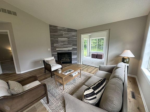 This beautifully remodeled, one-level twin home in the desirable Cottages of Cold Water Creek offers the perfect blend of modern convenience and serene living. With an open-concept design, the spacious eat-in kitchen features a large bar that flows seamlessly into the dining area and living room, all highlighted by stunning new granite countertops. The home boasts 2 bedrooms, 2 bathrooms, and a versatile sun-room with French doors leading to a private patio and backyard. Additional highlights include a cozy gas fireplace, brand new carpeting, Luxury Vinyl Plank flooring, and a fully enclosed 3-season porch. The oversized 2-car garage provides ample storage, while the neutral color palette throughout enhances the bright and airy atmosphere. Enjoy a peaceful, nature-filled setting in the back, making this home truly exceptional.