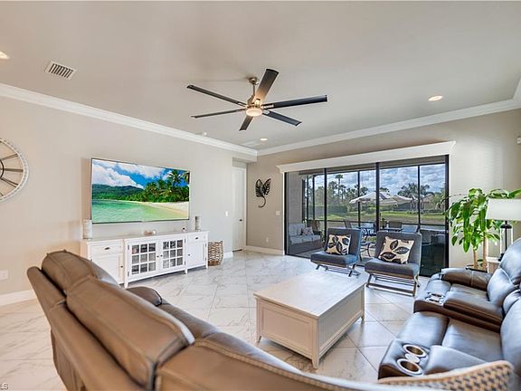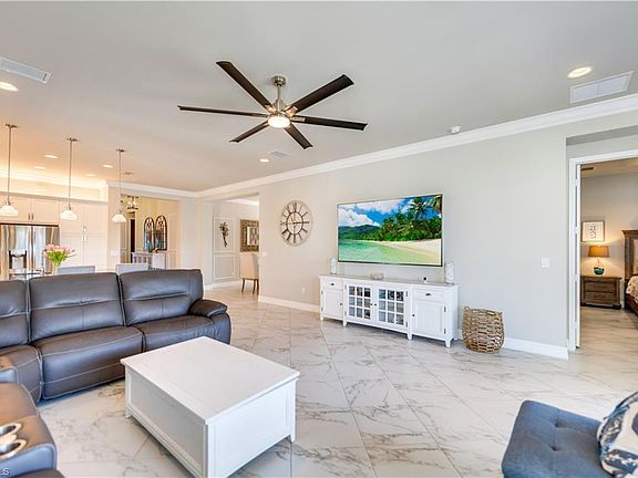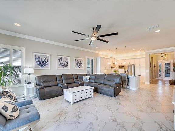 Photos don't do this home justice! You must see it to experience the thoughtful care and elegant design that the sellers have poured into this home! This open concept Cayman floor plan, built by GL Homes, set on a corner homesite with a garden like setting on one side, and Western sunset views over the water off the back. This home offers plenty of space for guests or family with 4 generously sized bedrooms and three full bathrooms. This immaculately kept home is loaded w/big ticket upgrades such as 24” tile throughout, custom trim & moulding, electric shades, coastal plantation shutters, premium glass shower doors, a welcoming screened front porch, professional landscaping & hurricane shutters throughout. Plus, an EXTENDED screened-in lanai to enjoy beautiful Southwest Florida sunsets. The chefs kitchen has modern stainless steel appliances, quartz countertops & there is a luxurious formal dining area for entertaining. Marina Bay offers fabulous amenities such as resort style swimming & lap pools, splash park, indoor sports complex, tennis, Pickleball, 24 hour state fitness center & more! Just minutes to Jet Blue Ballpark, RSW Airport, downtown Fort Myers & Fort Myers Beach.