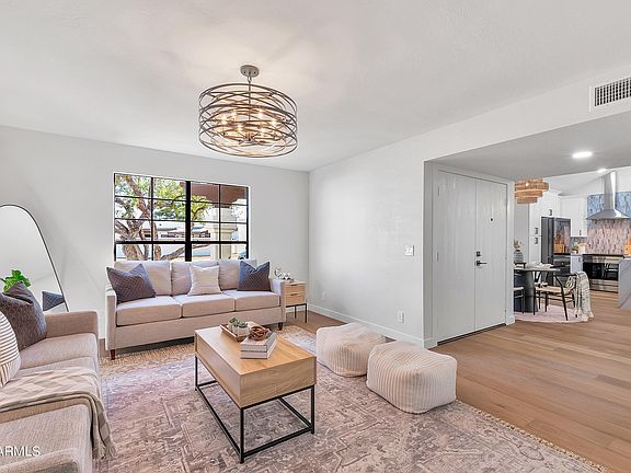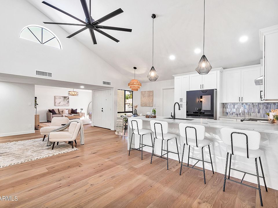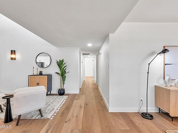 Stunning remodel on this beautiful home located in the heart of Scottsdale. Entire home has been renovated top to bottom w/ wood flooring throughout, stone (quartzite) countertops in kitchen & both bathrooms waterfall off the side, 42 inch shaker cabinets in the kitchen w/ Bespoke Modern appliances. 48 in x 24 in modern tile used in bath bathrooms. All lighting updated. Primary has 1/2 inch frameless shower glass panel/door.. Five panel modern style interior doors throughout. Backyard professional renovated by Crown and Blade w/ new turf, pavers, all new irrigation/timer & ficus plants . Roof just re-rolled w/ elastomeric and HVAC approx 1 year old. Garage floors w/ new epoxy. All work performed by Licensed contractors.