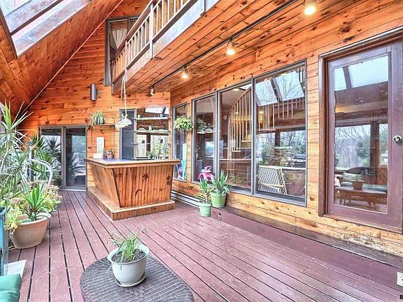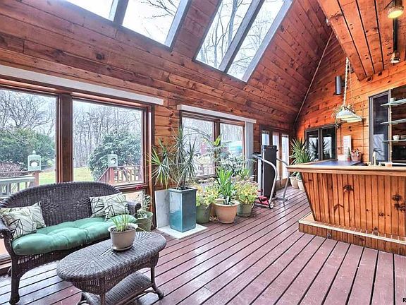 Uniquely designed Passive Solar contemporary home offering 3 acres of privacy & seclusion. This 3 BR, 2.5 BA home features beautiful wood flrs, open spiral staircase leading to 2nd floor & large kitchen w/oak cabinets, ceramic tile flrs, marble countertops & separate dining area. 4 season room w/skylights & built in wet/dry bar. Mstr BR w/ interior balcony, wood flrs, & full BA. LR & FR have hardwood flrs & wood fireplaces w/Pellet Stove inserts.