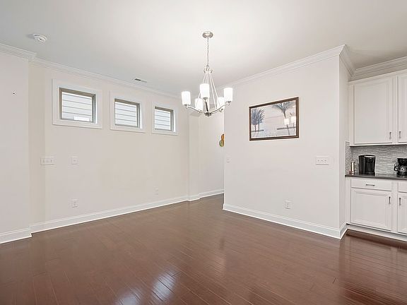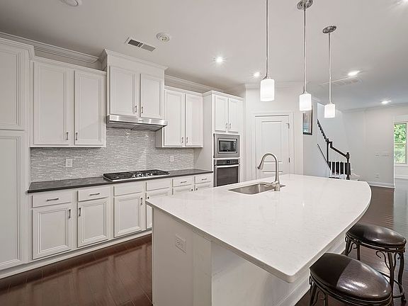 This beautifully bright home boasts soaring ceilings and an abundance of natural light, thanks to large windows that create an open and airy atmosphere throughout. The main floor's open-concept design seamlessly integrates a spacious dining area, a generous living room, and a sunroom overlooking tranquil greenery. The sleek white gourmet kitchen is a dream for any chef, complete with a large island, gas range, walk-in pantry, and stainless steel appliances.