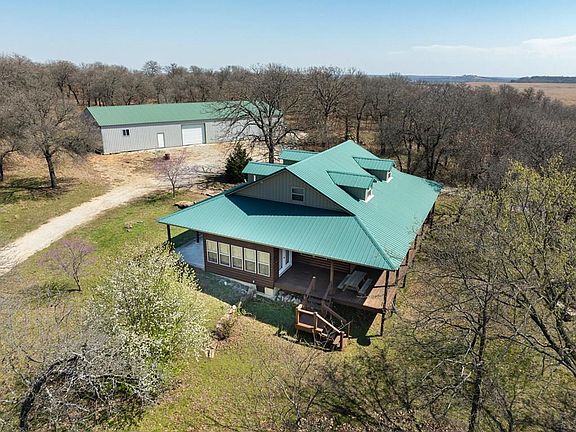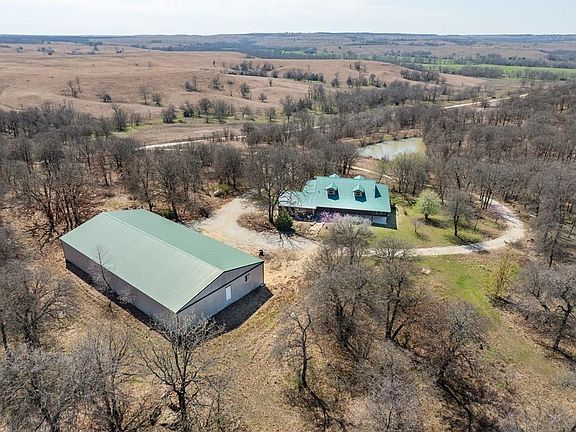 Beautiful Log veneer cabin built in 2008 and 80 Acres; A mosaic mix of hard wood timber and lush Bluestem grasses in the middle of the Cross Timbers area in East Central Kansas. Located just seven miles West of Fredonia and a mere five miles due East of the renowned Flint Oak Resort Ranch. This will make an excellent home or weekend retreat. Prime deer and turkey habitat and hunting as well as fishing in the pond below the cabin. Picturesque views from inside and outside of the cabin. Rustic woodwork and wood floors inside with lots of windows for watching nature. The kitchen is designed for the weekend Chef. Central Heat & Air. Safe Room in Garage. 48 X 96 metal building constructed in 2001, insulated, 200 amp breaker. 83 miles from Wichita.