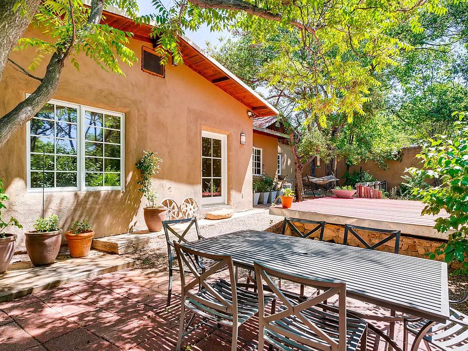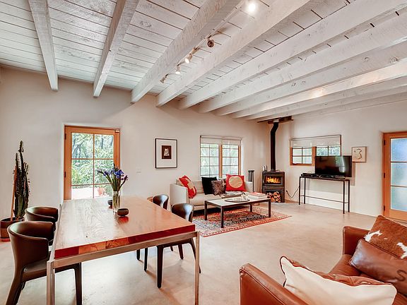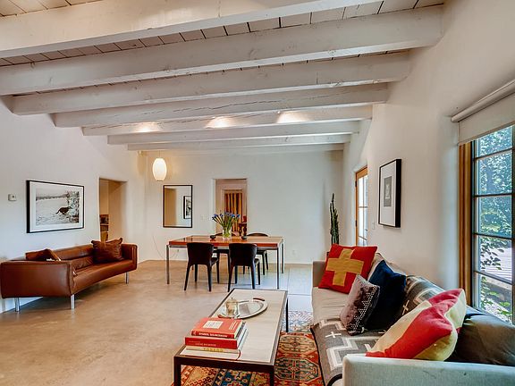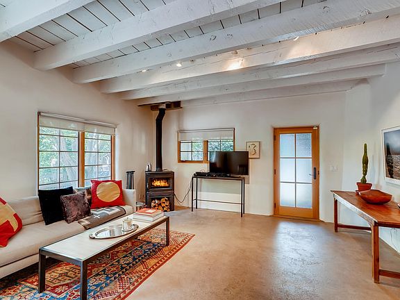 Simply sensational contemporary, romantic adobe with a European vibe. Austere, slightly monastic and oh so cool and hip. A real retreat - modern farmhouse with red metal , pitched roof, concrete floors and the most gorgeous white plaster thick walls you have seen. Redesigned by a well known local artist who definitely put her gallery spin on this one! Surrounded by bosque-like grounds and trees including the Acequia Muralla - all that the Eastside promises. Sits on a hilltop 1/4 acre just above and overlooks Camino Pequeno. Beautifully remodeled with such taste and elegance. These just do not come along very often at this price point. Aside from the 2 bedrooms there are additional rooms for including office and even a dressing room! Beautiful "Tea for two" Kohler bath tub in a luscious and spacious owners suite bath! Outstanding farmhouse style kitchen! This spectacular home sits down a small dead end lane and does not have to contend with the traffic from Cerro Gordo. Close in, stone's throw to Canyon Road. Walk everywhere. This is truly an oasis and honestly pretty rare in my opinion!