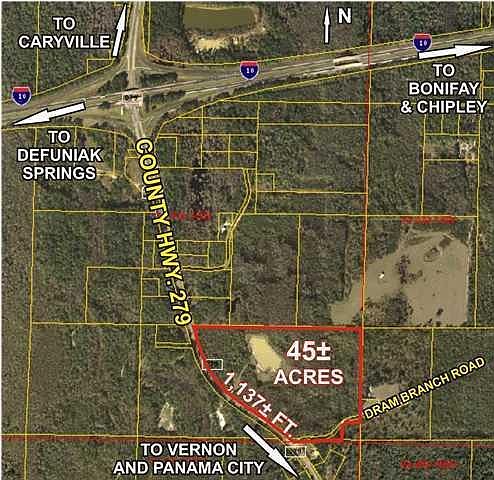 This prime vacant parcel is located on Washington County Highway 279, .5 miles south of Interstate 10. The site offers 1,137 Ft. of highway frontage and access from the south via Dram Branch Road. Site was previously permitted as a barrow pit (Whites Construction Pit). DEP Jurisdictional wetland exist on this property in the form of 2 ponds and Dram Branch a feeder creek of the Choctawhatchee River. A topographical survey of the entire parcel, wetlands delineation topographical survey of the western portion of the property, as well as, soil boring reports and associated barrow pit documents from the Washington County Planning and Zoning Department are available upon request.