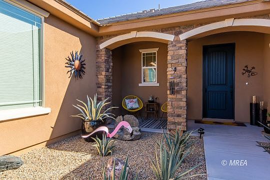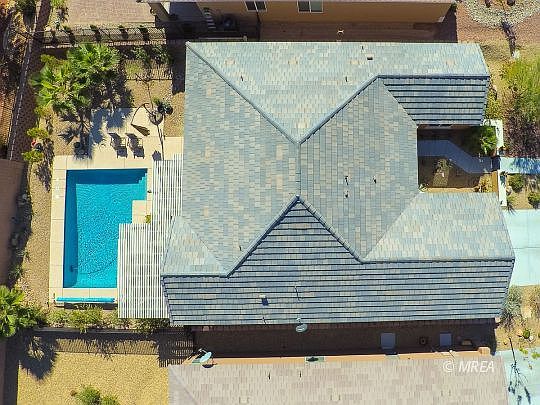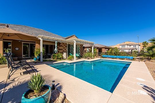 Simply impressive. Situated on a spacious home site in the popular development of Spanish Bay, this gorgeous desert home offers a private swimming pool, cozy front court yard and beautiful mature landscaping. The eastern orientation of the back yard is ideal for year round outdoor use. An additional pergola that extends the patio, allows for plenty of space to relax and/or entertain. The open floor plan is popular with two master suites located at opposites ends of the home. Both master bathrooms offer upgraded tile surround showers and large walk-in closets. The powder room/half bath is a bonus for sure. A modern kitchen anchors the home and hosts a gorgeous oversized island that has been updated with new granite. The decorative tile behind the stainless hood is creative and accents the popular subway backsplash. Upgraded cabinetry, cabinet pulls, stainless appliances and two tone granite make for a cool custom kitchen. Costly window treatment, ceiling fans and a whole house water conditioner have been installed. The garage is exceptional with an additional tandem space offering over 36 feet in length on one side. The HOA's are minimal at $70/monthly and the SID is PAID IN FULL.