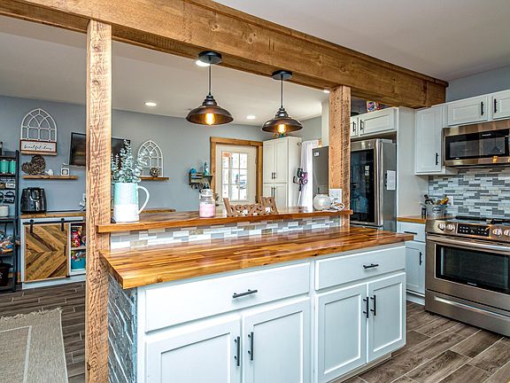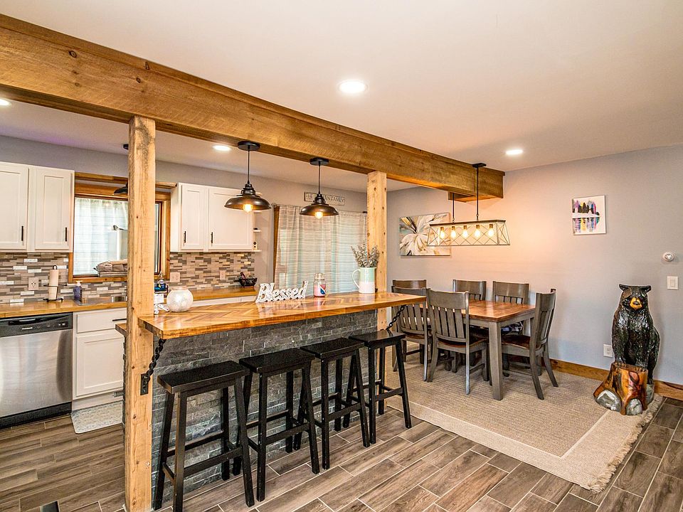 HUGE price reduction! Do not miss your opportunity to own this gorgeous, fully renovated 3-bedroom, 2.5 bath home sited on a +/- .67 acre lot. The home was taken down to the studs and everything was replaced, including insulation, wiring, plumbing, heating, walls, flooring, windows, cedar shake siding (with weaved-in 9' moose), and the drilled well pump. The interior of the home was reimagined to keep the charm of the original time period, with exposed wooden beams to meld with modern comforts. Beautiful custom butcher block countertops and stainless steel appliances perfectly accent the well-laid-out kitchen, which offers plenty of cabinets and a productive workflow. You will find a large sunroom off the kitchen, which leads to the back deck with custom driftwood railings. The living room has a pellet stove and a propane fireplace (not connected) to supplement the heat and create a cozy ambiance. There are two large walk-in closets and a full bath to complete this level. Upstairs, you will find a primary en-suite with a half bath and two large bedrooms that all share a bath. The basement is accessed via a walkout lower door and has been spray foamed to maximize efficiency. A large wrap-around deck provides sitting areas and access on 3 sides of the house to take full advantage of the mountain view. A new 16' x 24' heated garage provides parking or a great place to have a workshop with storage above.