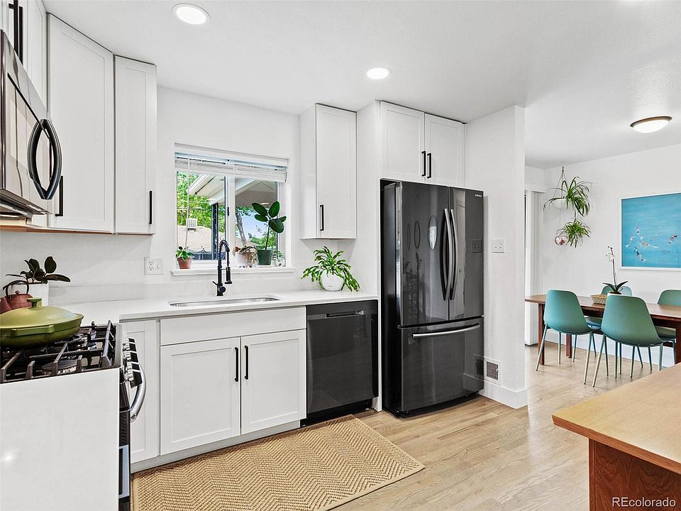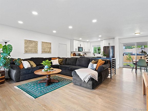Welcome to this bright and updated ranch home on a calm street, just moments from the trails and lake at Belmar Park, with all the shopping and numerous restaurants nearby. Not to be missed, this home is an easy walk to Pizzeria Lui and near the new and upcoming area of Westwood on Morrison Rd. It features a wonderful open concept living area, with a fresh and well-organized kitchen overlooking the back yard, with quartz countertops and black stainless-steel appliances. A large living room and a dining area all in one space for easy entertaining. On the main floor you will find three bedrooms, all with an abundance of natural sunlight and good-sized closets. Solid oak hardwood floors flow through the entire main floor and the living area features a custom iron railing around the stairs to the basement.  One bedroom has its own powder-room and the main floor bathroom is light and airy with a modern esthetic sure to please. In the basement there is a large laundry room with more storage, and two additional bedrooms, one of which is the largest and could easily be the main bedroom. The large basement flex room features a unique custom-built bar with birch butcher block counters, has waterproof LVP flooring and can be used as a second living room, entertainment room, or anything you desire! An attached one-car-garage with plenty of storage and a separate storage shed in the backyard adds to the abundance of storage this home has to offer. The back yard is private and quiet, with a large, covered deck and features a fire pit for the chilly evenings and large garden boxes waiting for you to plant your preferred plants for the summer. Please see property video for a more detailed tour of the home: https://media.livsothebysrealty.com/public/vtour/display/2055363#!/
