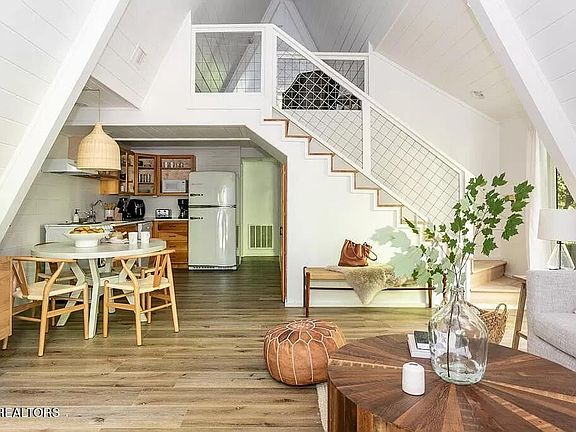 Discover your dream mountain getaway with this charming 2 bedroom, 1 bathroom, 900+ sq ft A-frame chalet. Nestled along Ski Mountain Road, this lovingly restored retreat is just minutes away from the vibrant heart of downtown Gatlinburg. Whether you're seeking a permanent residence, a second home, or a lucrative overnight rental, this property can do it all! Situated on a city-maintained road in desirable Chalet Village with convenient access to street cleaning, garbage pick up, city water and sewer services. This vintage chalet opens up to a spacious great room, blending a cozy living area with a wood stove fireplace, an open dining space and a fully updated kitchen. The primary bedroom is a haven of comfort, featuring a stacked washer/dryer utility area and direct patio access. The upstairs loft bedroom provides privacy and secluded balcony access! Step outside to the partially wraparound patio, complete with a rejuvenating hot tub — perfect for unwinding after a day of adventures. Embrace the opportunity to own a slice of the Smoky Mountains with this beautiful, well-situated chalet. You'll be about two miles or less away from some of the area's most renowned attractions, including the Great Smoky Mountains National Park, downtown Gatlinburg, and the Ober Mountain Ski Resort!