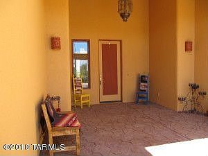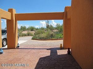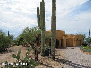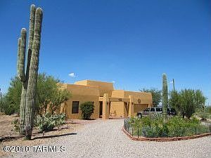 Drive up the beautiful circular drive to this one of a kind custom Santa Fe home on 3.95 acres bordering Saguaro National Monument. In addition to the 2034 sq ft main house,there is an additional 768 sq ft shop/studio with electricity,water,and 2 RV hook ups with a separate septic. The main house has a fabulous kitchen with 42'' upper cabinets and roll out shelves. Lots of tiled counter space including a 9 ft ''sit up'' breakfast bar. The great room features a dining area with bay window,large g