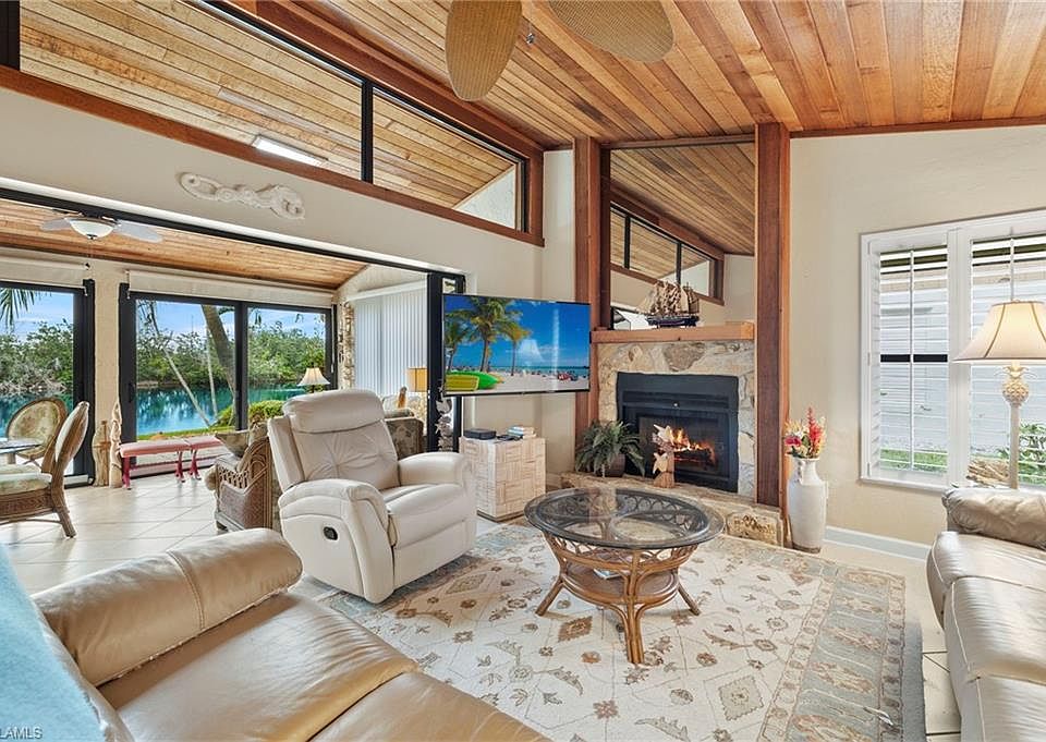 Fantastic opportunity to own a single-family residence in the desirable Cinnamon Cove. Nestled within this residence is a 2-bedroom, 2-bath retreat, boasting ample living space that transitions from casual living to entertaining. Indulge in the warm ambiance set by the beautiful wood ceilings that highlight both the living room and Florida room. Tile throughout the home and a seamless transition to rich wooden floors will lead you to the bedrooms. The garage is an ideal storage solution and can accommodate 2 vehicles. From the sanctuary of your enclosed Florida room, these impact sliders offer a gateway to your private exterior space. Here, a sophisticated, paved area awaits your footprints. Secure in stormy weather, the home is equipped with hurricane shutters. You can enjoy an array of community features such as the swimming pools, spa, pickleball, tennis court, fitness center and more. Cinnamon Cove offers the perfect location, a stone's throw from Fort Myers Beach, delightful local dining, RSW international airport and great shopping. This property did not flood. Note, this vibrant 55+ community requires at least one resident to be 55 years or older.