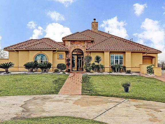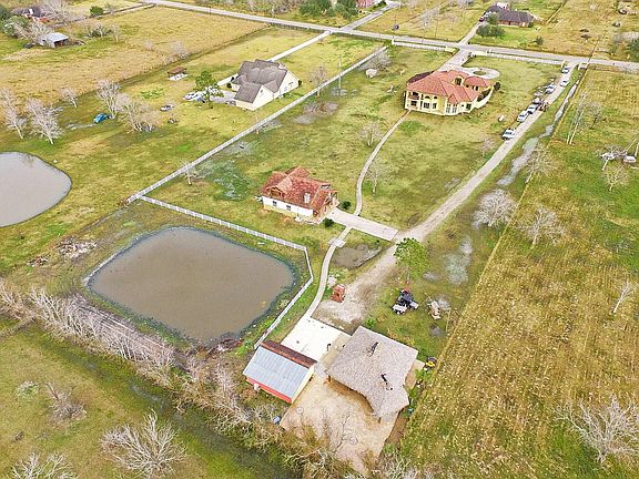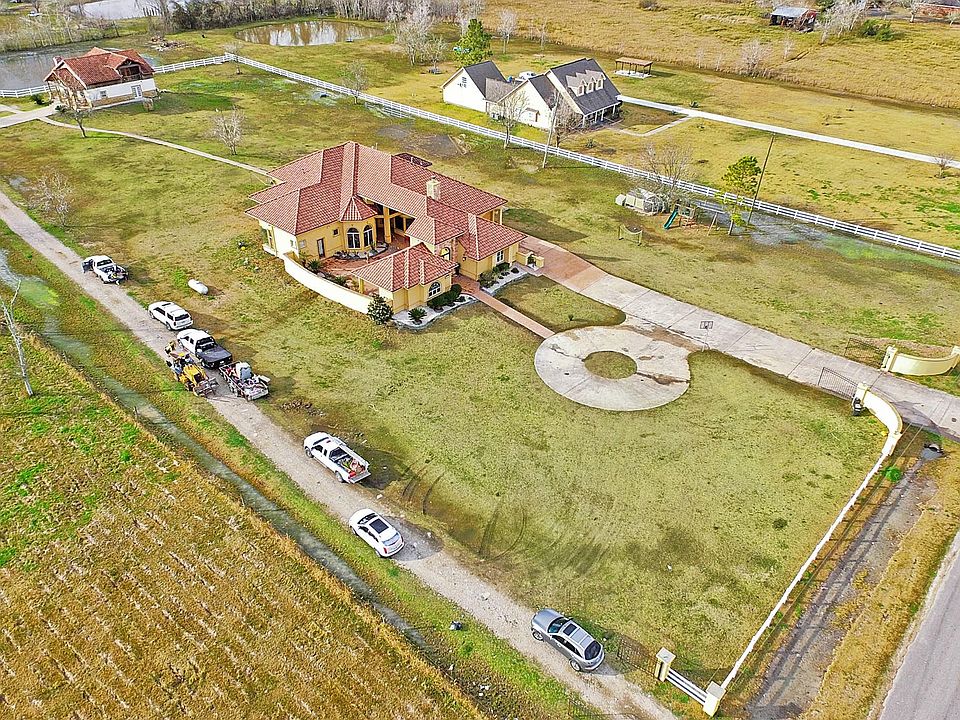 Custom Built, Luxurious and Stunning Custom Made Mediterranean Style sitting on Four acres 5+ bedrooms 3 full bath and 2.5 Bath. Property has a circle drive and two driveway entrances. This Home is ready for a big family that enjoys the peace and country living with lots of privacy! Unique and Exquisite matching slate stone on fireplace and kitchen backs plash. Three horse stables and an outdoor Bar topped with a Grand Palapa. Big Pond next to the Cabin. Gorgeous Crystal Chandeliers included with the sale. Plus It includes a Guest suite with a private full bath. Amazing two story fully furnished Cabin including some furniture in the sale 2 Bedrooms, 2.5 bath. On the second floor has an Entertaining area, Bar and a Basement! Property did not flood and it is elevated higher than city requirements.