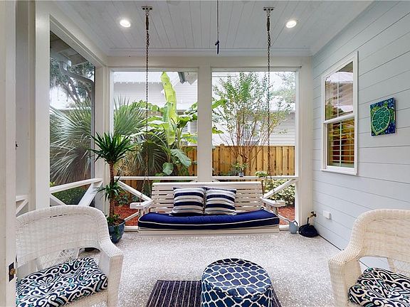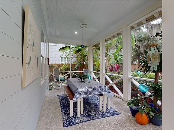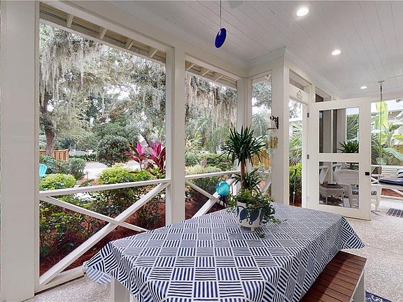 This 3 bedroom, 3.5 bath island retreat is just slightly more than a mile from the water on East Beach. As you first step onto the grounds of this tropical oasis, you will be welcomed into the home through a large screened porch perfect to eating and entertaining. The great room features large living room and dining space with fireplace. The large gourmet kitchen has professional range, white cabinets and contrasting main island. Downstairs master bedroom has coffered ceiling, large walk in closet and spectacular marble master bath. High end finishes including beautiful wood flooring and sisal floorings, shiplap and brick detailing. Downstairs is complete with a large laundry room, butlers pantry leading to two car garage and half bath. Large open stairway leads to the homes two guest bedrooms and baths plus the bonus space connecting the two bedrooms. Home's additional feature is its extensive lush landscaping. Home available fully furnished for $695,000. See 3D tour.