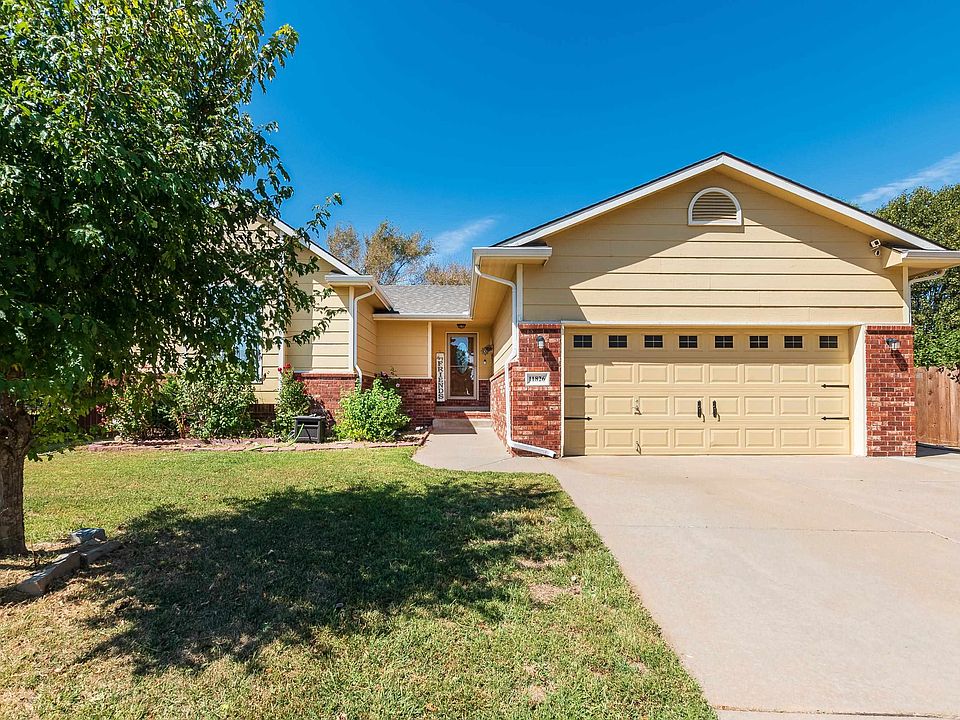 Wonderful ranch style home on private cul-de-sac in Goddard School District with 4 bedrooms and 3 bath and 2 car garage. On main floor there are 3 bedrooms, 2 bathrooms, living room, kitchen and dining area. 1-bedroom, large family room with gas fireplace, wet bar and storage room in viewout basement. Kitchen boasts white cabinets with granite countertops and bayed windows in dining area. The lot is very large with great wood deck and 2 cement patios. The roof is 3 years, H2O is 4 years and HVAC is 1 year. Backyard is fully fenced. Information is deemed reliable, but not guaranteed.