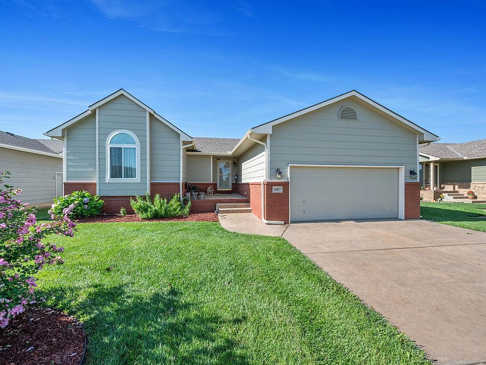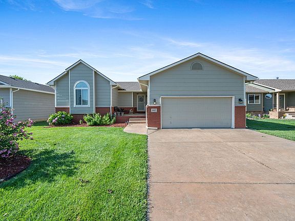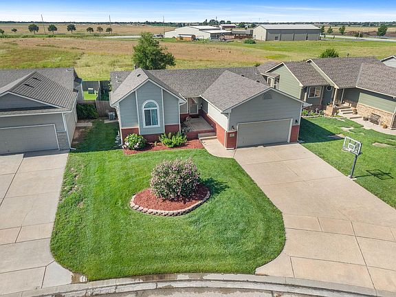 Welcome to this beautifully maintained 4-bedroom, 3-bathroom home, perfectly situated in the highly desirable Goddard School District. From the moment you arrive, the freshly painted exterior and meticulously landscaped yard create an inviting first impression. Step inside to find vaulted ceilings and spacious rooms filled with natural light. The kitchen and dining area feature durable wood laminate flooring, an eating bar, gas stove, and a reverse osmosis system. The primary suite offers a peaceful retreat with a vaulted ceiling, large window with a cozy window seat, walk-in closet and attached bathroom. There are two additional main-floor bedrooms and a full bathroom. Downstairs, enjoy movie nights in the family room complete with a projector, surround sound wiring and a dry bar. A fourth bedroom, third full bathroom and generous storage space with built-in shelving complete the lower level. Enjoy the outdoors in your private, fully fenced backyard that backs up to an open field—offering both privacy and peaceful views. A spacious deck and patio area make the perfect spot for relaxing or entertaining.
