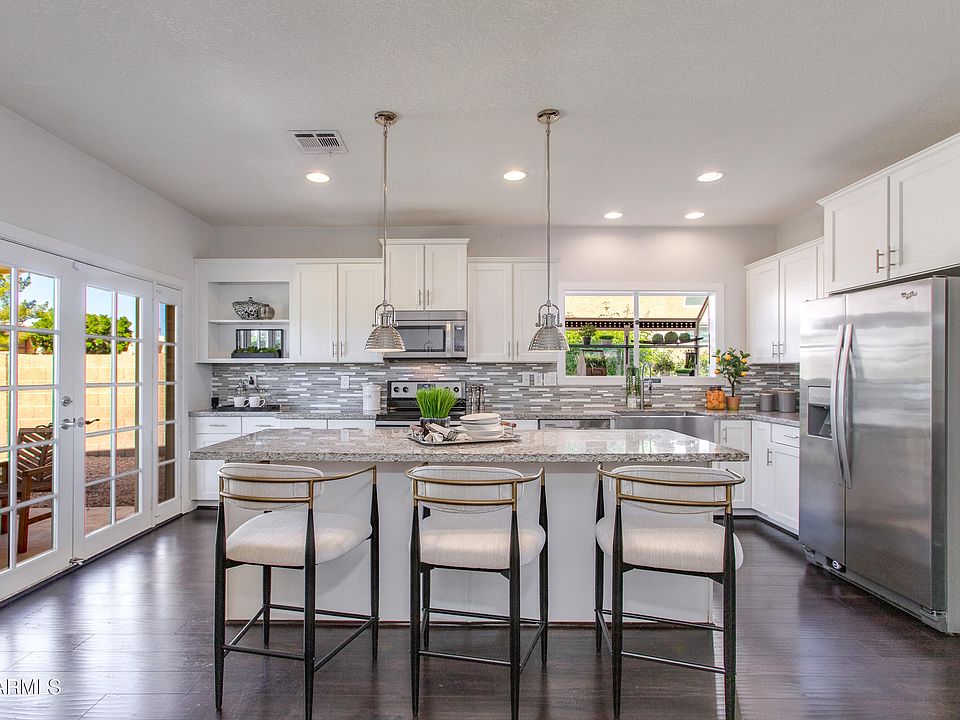Welcome to Trailside at Manzanita Ranch in North Scottsdale! This beautifully updated 3-bedroom, 2-bath home combines designer upgrades with low-maintenance living in a highly sought-after location near the Cactus Corridor. Step inside to find vaulted ceilings, upgraded wood flooring, fresh paint and new carpet. The floor plan flows beautifully and offers plenty of space to live and work comfortably. The kitchen is a chef's dream with custom cabinetry, granite countertops, stainless steel appliances, and a beautiful island ideal for gatherings. A charming garden window adds light and character. The kitchen seamlessly connects to the family room where a wood-burning fireplace creates warmth and ambiance. French doors with sidelight windows invite natural light and fresh air indoors. Outdoors, your private retreat awaits with a covered patio for morning coffee, a custom putting green for sunset rounds, and a heated spool for year-round relaxation. Mature landscaping with ficus trees creates the perfect backdrop for entertaining or unwinding in style. All in a prime Scottsdale location minutes from premier shopping, dining, golf, and easy access to the Loop 101. Curated, move-in ready, and designed for the lifestyle you've been waiting for.